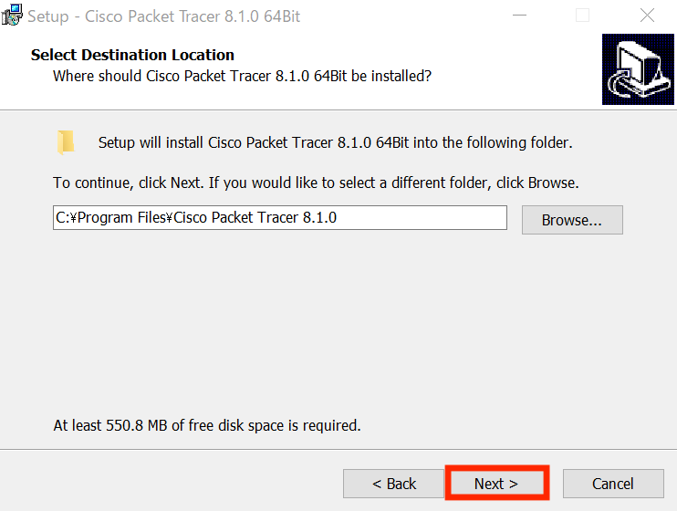 続いて Packet Tracer のインストール先を指定します。特に希望がなければそのまま「Next >」をクリックします。